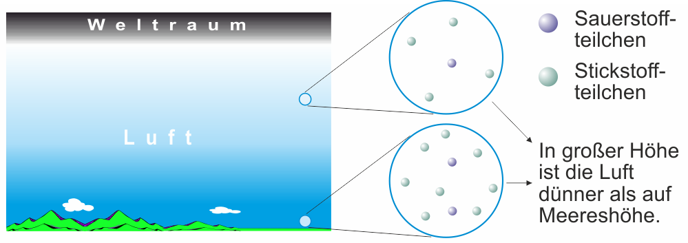 Die Dichte der Luft: Auf Meereshöhe hat die Luft eine Dichte von ungefähr 1,3 kg/m³. Auf dem Großglockner (in 3 800 m) ist die Dichte schon um ein Drittel kleiner. Auf dem Mount Everest (8 850 m) ist sie sogar um fast zwei Drittel kleiner als auf Meereshöhe. Deshalb ist es für Bergsteigerinnen und Bergsteiger schwierig, in dieser Höhe dem Körper ausreichend Sauerstoff zuzuführen. Deshalb werden hier oft Sauerstoffflaschen verwendet.