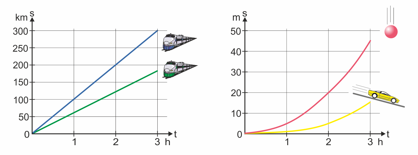 Gleichförmige Bewegung: Wir vergleichen zwei Züge, die mit konstanter Geschwindigkeit fahren. Einer fährt mit 60 km/h, der andere mit 100 km/h. Da die Geschwindigkeit der Züge gleich bleibt, bekommen wir Geraden parallel zur Zeitachse. Dabei betrachten wir immer nur die Größe der Geschwindigkeit, also das Tempo.