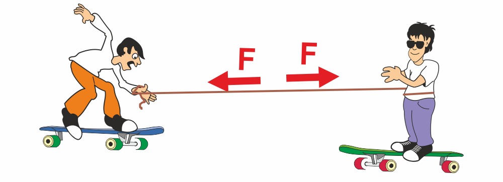 Nimm ein Gummiband und ziehe daran. Du merkst, das Gummiband zieht in die entgegengesetzte Richtung. Stell dich auf ein Skateboard. Ein Seil wird um eine Mitschülerin oder einen Mitschüler gebunden, die oder der ebenfalls auf einem Skateboard steht. Nur du ziehst am Seil. Es bewegen sich aber dennoch beide aufeinander zu.