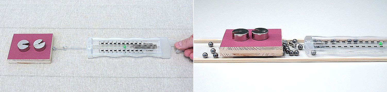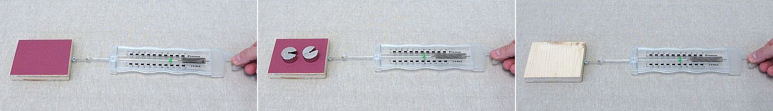 Das Brett ziehen wir mit dem Federkraftmesser möglichst gleichförmig über den Tisch und beobachten, wie groß die Kraft ist, mit der wir ziehen müssen. Wir machen die Messung nacheinander mit der glatten und mit der rauen Oberfläche, sowie ohne und mit Massestücken auf dem Brett. Die Massestücke üben durch ihr Gewicht eine Kraft auf die Berührungsflächen aus.