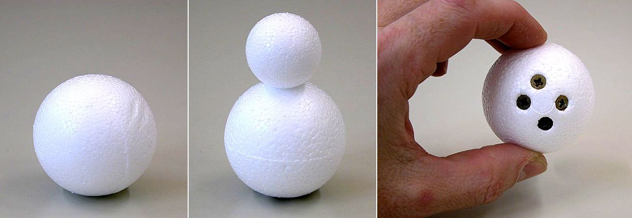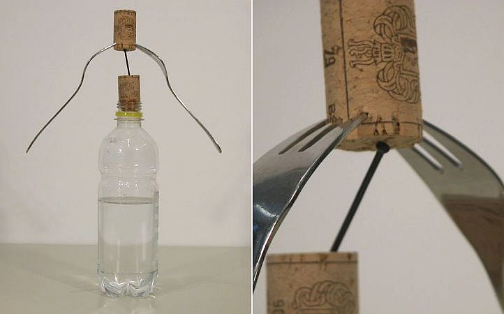 Baue eine Vorrichtung, die so ähnlich aussieht wie hier abgebildet. Die Wasserflasche dient als Halterung für den Korken. Der Nagel wird schräg in den unteren Korken gedrückt. Der obere Korken mit den Gabeln liegt aber nur auf diesem Korken. Trotzdem kippt er nicht um und fällt nicht herunter.