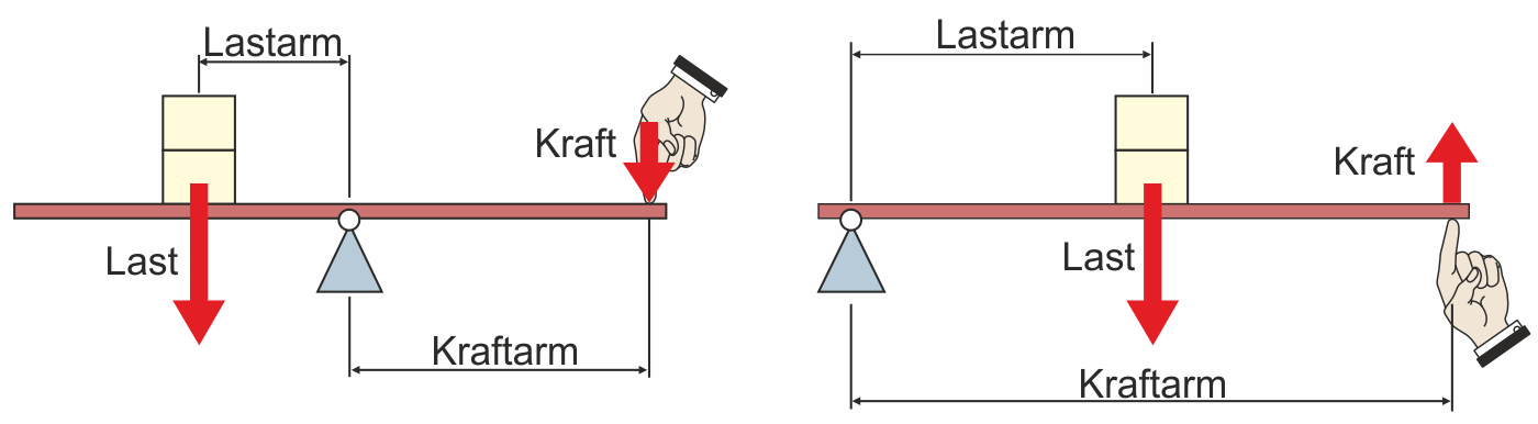 vom Drehpunkt aus zu messen sind. Beim einseitigen Hebel muss eine Kraft nach unten und eine nach oben wirken.