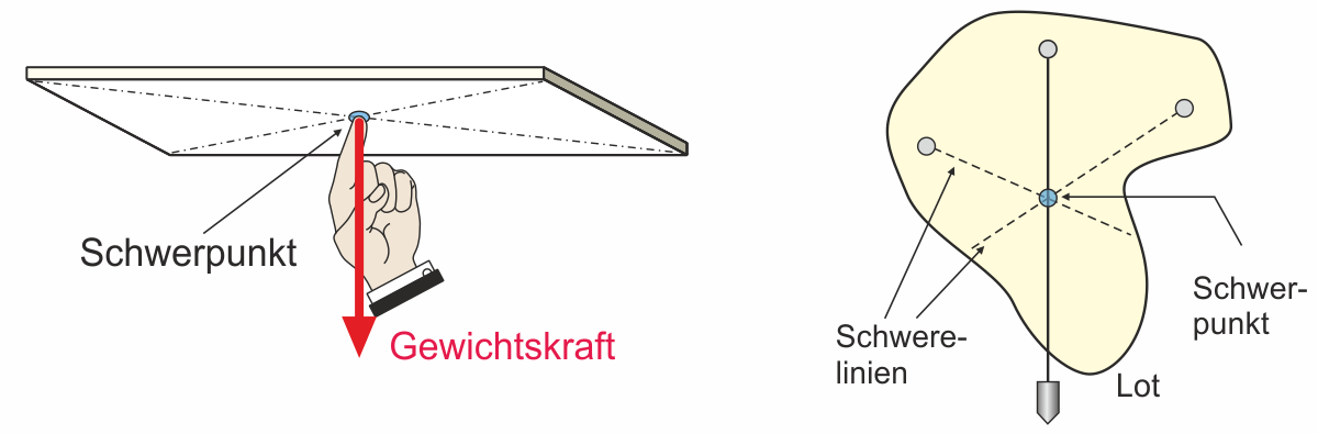Jeder Körper hat einen Schwerpunkt. Auch unregelmäßig geformte Körper haben einen Schwerpunkt, allerdings ist er schwieriger zu finden. Man kann es durch Probieren versuchen, oder aber den Punkt durch ein Experiment finden. Dazu hängen wir den Körper drehbar (zum Beispiel auf einer Stecknadel) auf. Am Drehpunkt (also an der Nadel) befestigen wir einen dünnen Faden und daran ein kleines Massestück. Die Linie des Fadens ziehen wir mit einen Stift nach. Man nennt diese Linie Schwerlinie. Das wiederholen wir an anderen Stellen des Körpers. Alle Schwerelinien schneiden sich in einem Punkt, dem Schwerpunkt.