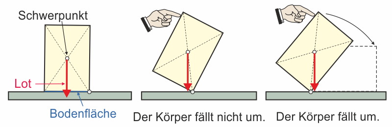 er aber um. Das Lot zeigt uns, wann das passiert. Der Körper fällt um, sobald das im Schwerpunkt angebrachte Lot auf eine Stelle außerhalb der Bodenfläche des Körpers zeigt.