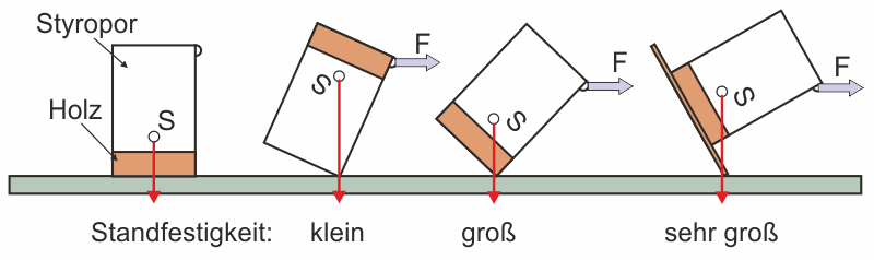 Tiefer Schwerpunkt und große Bodenfläche. Wir nehmen einen Quader, der zum Teil aus Holz und zum Teil aus Styropor besteht. Der Schwerpunkt ist nun nicht mehr in der Mitte des Quaders, sondern näher bei der Seite des Holzes. Wir wiederholen