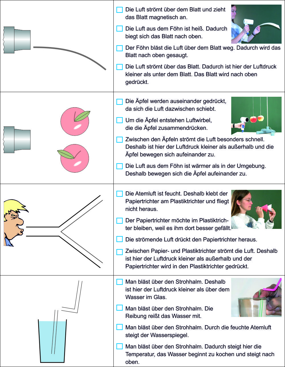 - Kreuze die richtigen Erklärungen an. Die Experimente sind zwei Seiten vorher beschrieben.