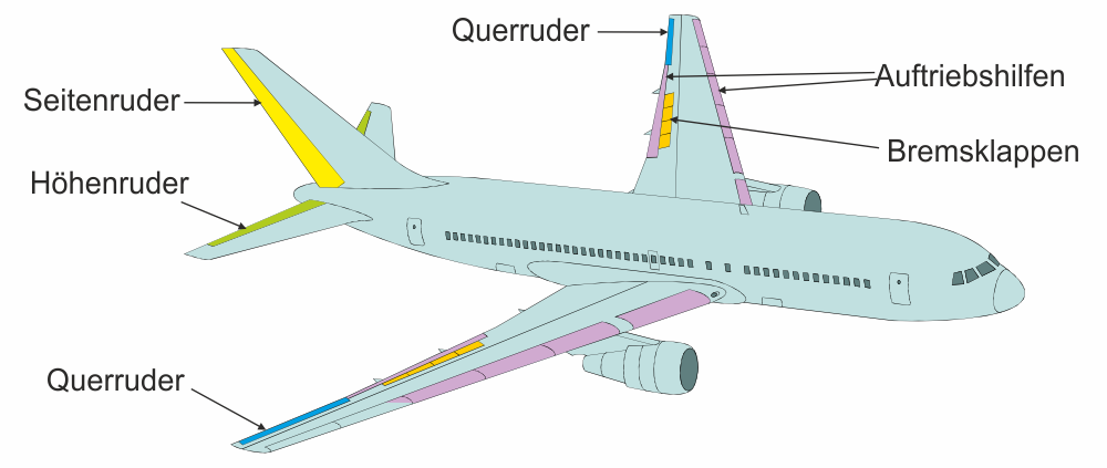 Steuerung des Flugzeugs: Die Steuerung eines Flugzeugs erfolgt mithilfe von Klappen, die in die Heckflossen und auch in die Tragflächen eingebaut sind. Sie können von der Pilotin oder vom Piloten nach oben/unten oder nach links/rechts gedreht werden. Mit Seitenruder und Querruder kann die Flugrichtung verändert werden. Mit dem Höhenruder kann bewirkt werden, dass die Nase des Flugzeugs nach oben gedrückt wird und das Flugzeug steigt.