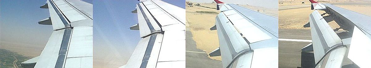 1: Alle Klappen an den Tragflächen sind eingefahren; 2+3: Vor der Landung werden Klappen zur Verstärkung des Auftriebs ausgefahren; 4: Direkt nach der Landung werden Bremsklappen aufgeklappt.