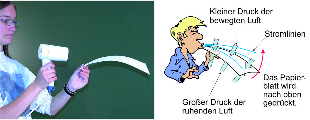 In strömender Luft ist der Druck kleiner. Wir nehmen ein dünnes Blatt Papier und halten es an einem Ende fest. Das andere Ende hängt nach unten. Die Ursache dafür ist natürlich das Gewicht des Blattes, das nach unten wirkt. Nun blasen wir kräftig über das Blatt (noch besser geht es mit einem Föhn). Die Stromlinien zeigen die Bewegung der Luft. Das Blatt wird nach oben gedrückt.