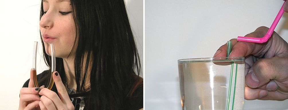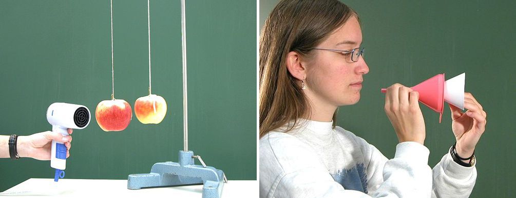 Dieses Experiment zeigt uns, dass der Druck in strömender Luft kleiner ist als der Druck in ruhender Luft. Solange der Luftdruck auf beiden Seiten des Blattes gleich hoch ist, hängt das Blatt wegen seinem Gewicht nach unten. Sobald man über das Blatt bläst, sinkt hier der Luftdruck. Es wird also der Druck kleiner, den die Luft auf das Blatt ausübt. An der Unterseite ist die Luft aber nach wie vor in Ruhe, am Luftdruck hat sich nichts geändert. Ergebnis: die Luft drückt von unten stärker auf das Blatt als von oben, das Blatt bewegt sich dementsprechend nach oben.