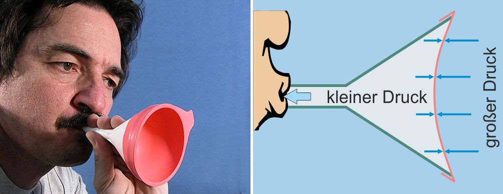 Wir spannen eine Luftballonhaut über einen Trichter. Von außen wirkt der normale Umgebungs-Luftdruck. Wenn wir auf der anderen Seite Luft heraus saugen, dann ist hier der Luftdruck kleiner. Der größere Luftdruck von außen drückt die Luftballonhaut nach innen.