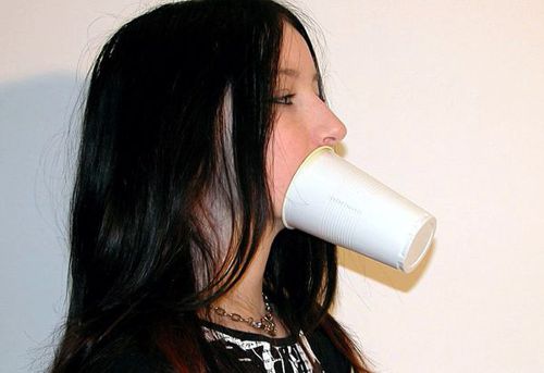 Nimm einen Plastikbecher und drücke ihn fest gegen deinen Mund. Wenn du nun Luft aus dem Becher saugst, hält er von selbst. Der größere Luftdruck auf der Außenseite drückt ihn gegen dein Gesicht. Es darf aber keine Luft zwischen Becher und Haut in den Becher strömen.