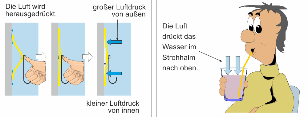 Da der Luftdruck von allen Seiten gleich auf uns wirkt und unser Körper an den Luftdruck gewöhnt ist, merken wir davon normalerweise nichts. Wenn aber auf einer Seite ein Unterdruck oder ein Überdruck erzeugt wird, können wir die Auswirkungen deutlich erkennen. Von Unterdruck sprechen wir, wenn der Druck kleiner ist als der Luftdruck in der Umgebung. Bei Überdruck ist der Druck größer als in der Umgebung.